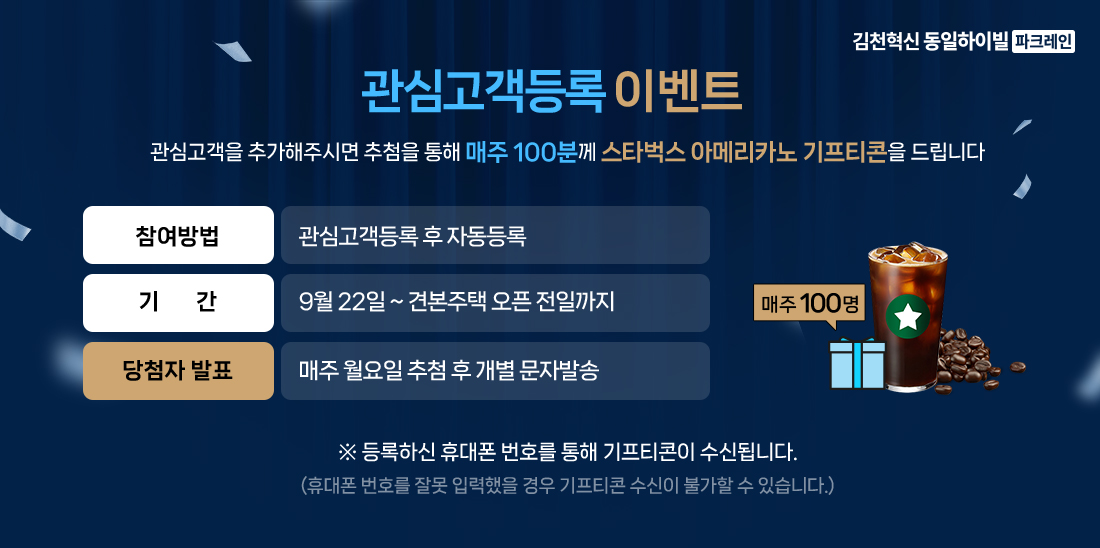김천혁신 동일하이빌 파크레인은 고객님께 분양 정보 제공에 필요한 최소한의 개인정보를 수집하고 있습니다.